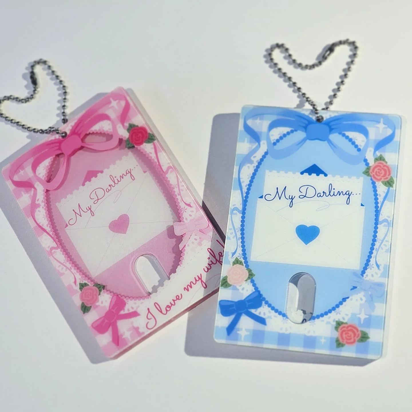 Shop › I Love My Husband / Wife Photocard Holder Image 1 of 3 Image 2 of 3 Image 3 of 3 I Love My Husband / Wife Photocard Holder £10.00 A standard size photocard holder on a silver ball chain. Color: Husband (Blue) Wife (Pink) Add To Cart Added! A standard size photocard holder on a silver ball chain. Reviews Reviewer Name Review Date Star Rating Description Posted on Etsy Product Show More